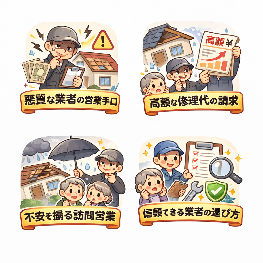 屋根の状態を所有者本人が目視確認できないこと。修繕費が高額になりやすく業者の利益が大きいこと。「このまま放置すると危険」という不安の訴求が効きやすいこと。訪問販売では断りにくい心理が働くこと。これらの要素が組み合わさり、悪質業者が参入しやすい市場となっています。
