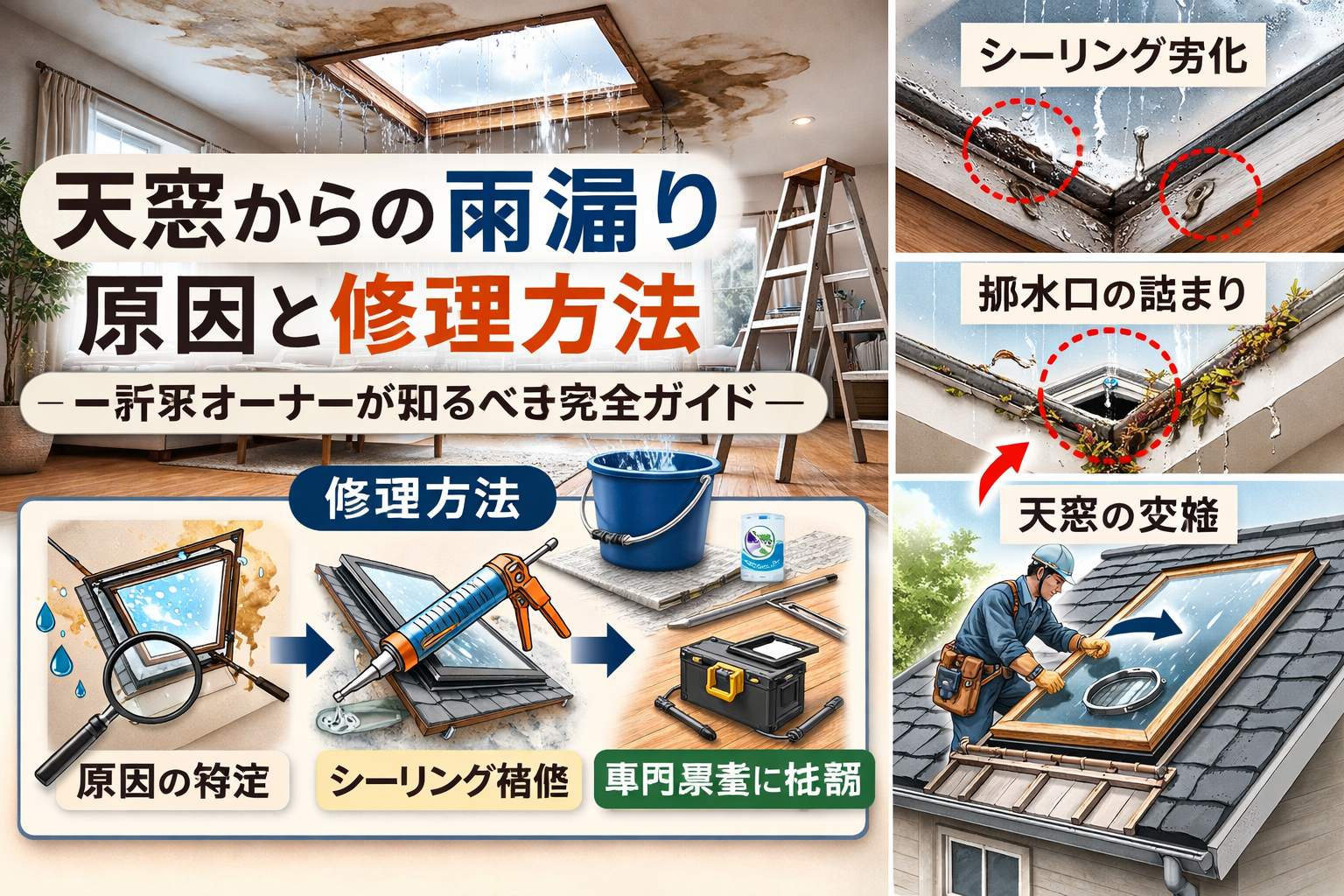 天窓の雨漏りは放置するほど修理費が膨らむトラブルです。シーリング劣化・フラッシング不具合・パッキン破損という3つの原因を解説し、応急処置・修理費用の目安・火災保険の活用法・信頼できる業者の選び方まで一軒家オーナー向けにわかりやすくまとめました。